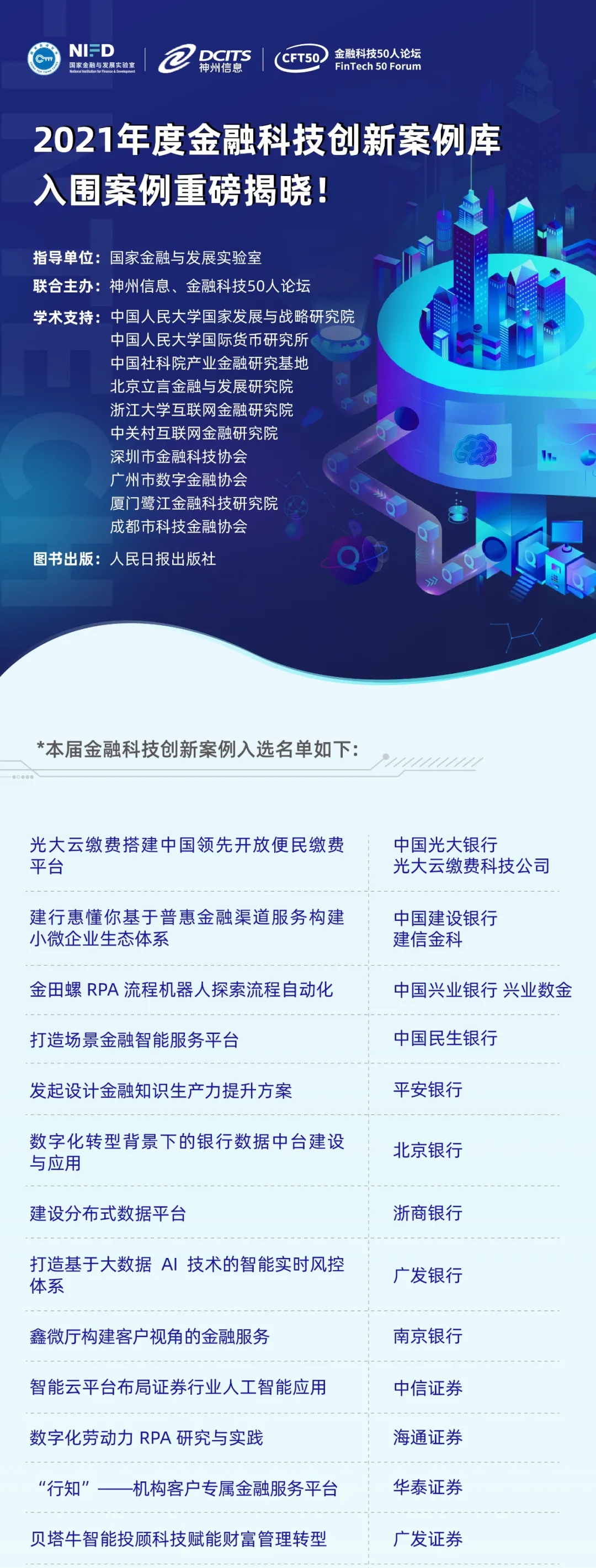 本届入库的28个案例,收录于《“数字经济+科技向善”金融科技创新实践2021》一书中,已由人民日报出版社发行。我们真诚地向为本书顺利出版提供过指导与帮助的专家和机构致谢,未来期待更多的金融科技生态伙伴参与到案例编写工作中。“NIFD-DCITS全球金融科技创新案例库”旨在建设成为国内外顶尖的金融科技创新案例聚合基地,不仅为政府、监管、金融机构和企业提供重要参考素材,还将为国内外院校的教学、研究提供鲜活资料,有效服务于我国金融科技的健康发展,并且向国际社会充分展示我国优秀金融科技企业的风貌。